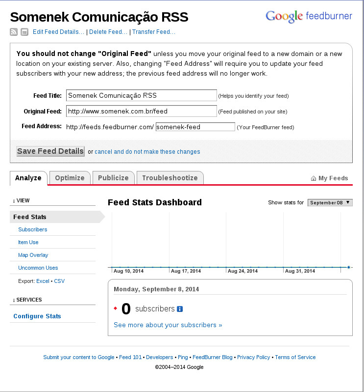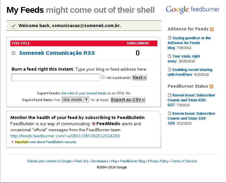 Para utilizar os recursos do RSS Feed, sugerimos fazê-lo pelo próprio FeedBurner, por ser fácil e intuitivo. Primeiramente, deve-se cadastrar no site do FeedBurner.